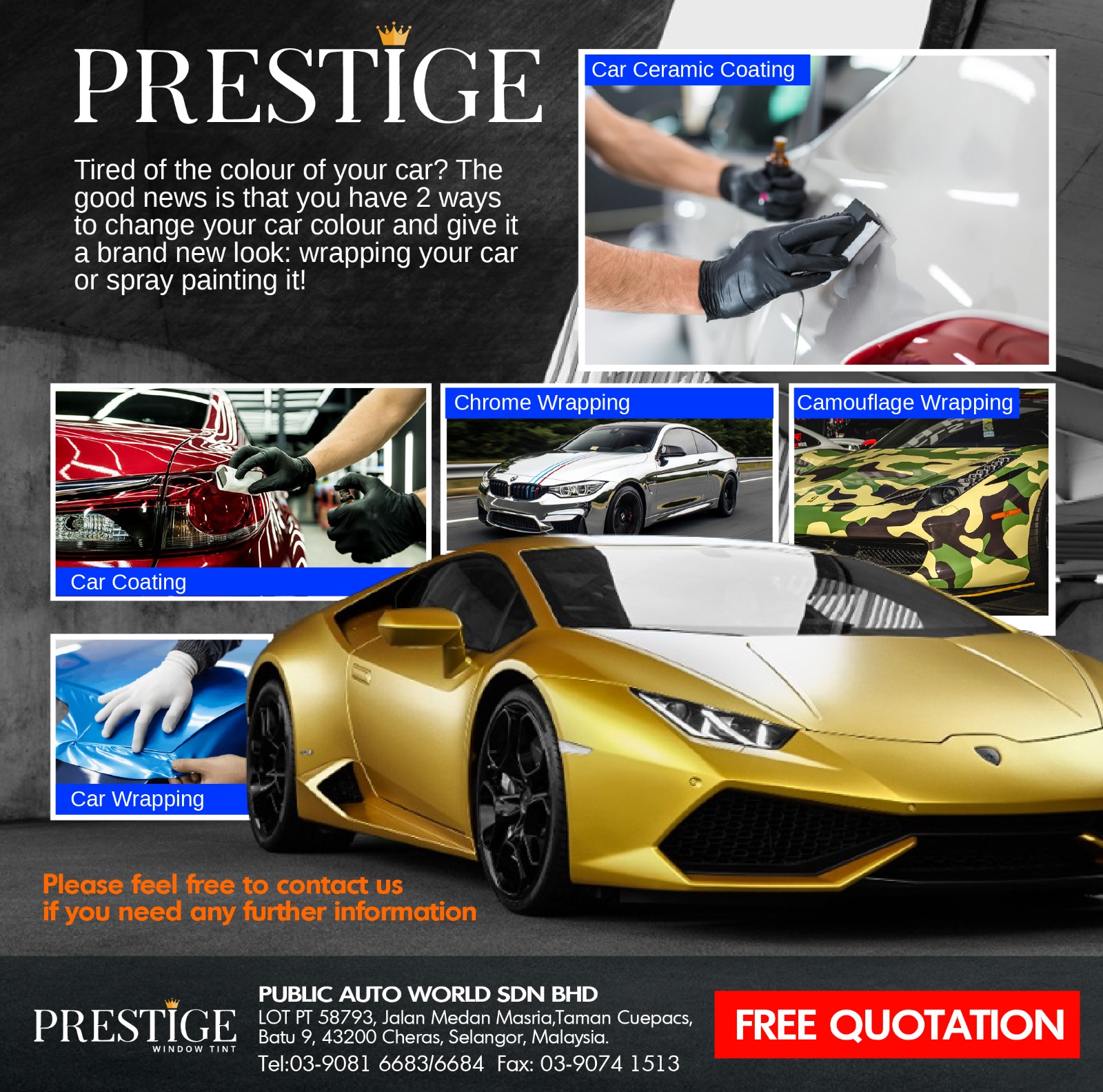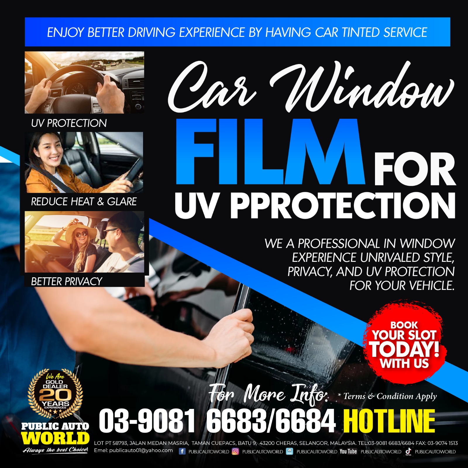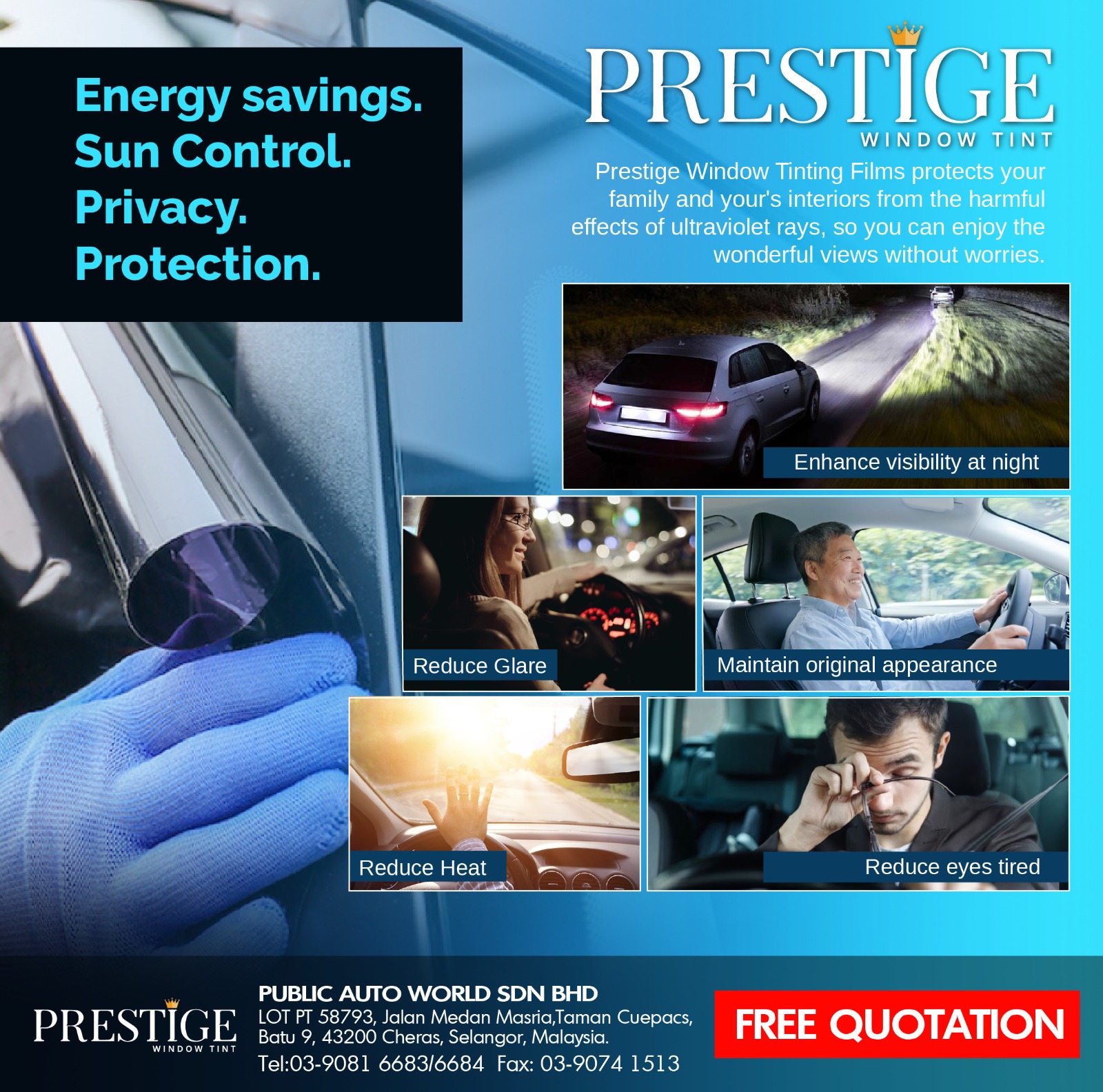 We know that long exposure to UV ray and HEV blue light will damage our eyes and skin, especially when UV index is very high in Malaysia and Singapore. PRESTIGE TINTED FILM aims to protect you from harmful UV rays and HEV blue light (380nm to 420nm) with the best optical solar film. Blocking 100% UV & 99% HEV blue light, customer will enjoy a reduction in eyes fatigue, prevent cataract, macular degeneration, skin cancer, wrinkles and dark spots.