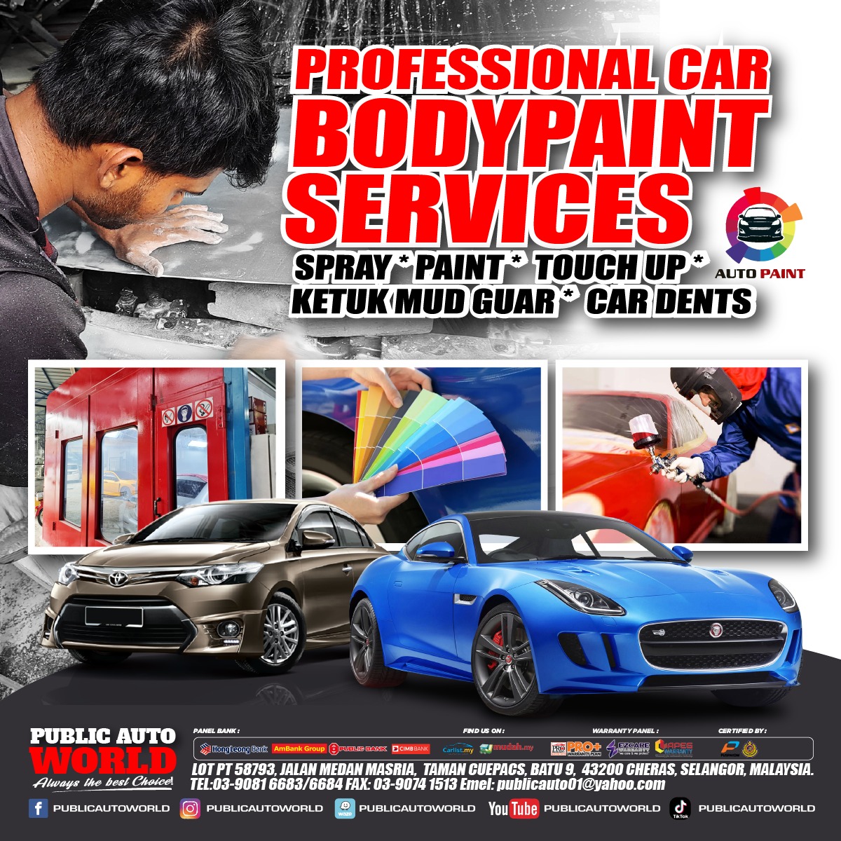 AUTO PAINT is a one-stop professional car spray painting company, fully equipped with state-of-the-art machines and climate-controlled spray booth. We implement unique processes and methods for long-lasting car spraying, car paint touch-up and vehicle body repairs by professionals. We offer a full range of professional spray painting service for all kinds of automobiles. We have a team of professional spray paint specialists with more than 10 years of experience. Our workmanship is exquisite, professional, practical and it is reflected in the work we do. You get to choose from a wide range of colours to give your car an all new trendy look, absolutely better than the original quali